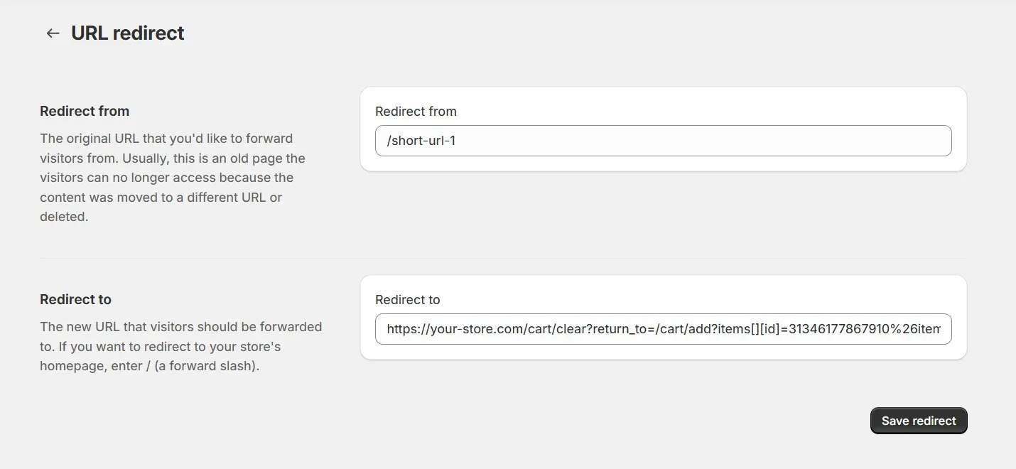 The "Redirect from" should be a new short link, and the "Redirect to" should be your instant checkout link.